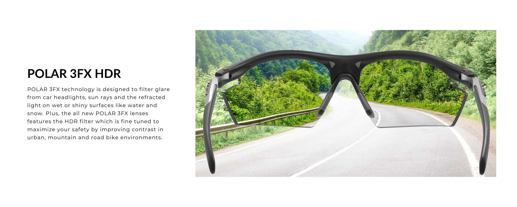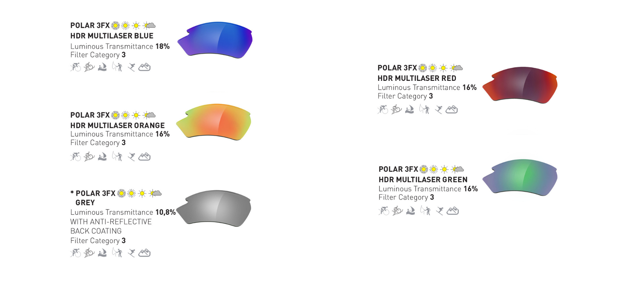 Our POLAR 3FX technology protects your eyes from harmful UV rays and eliminates glare by selectively filtering non harmful wavelenghts through the lens. POLAR 3FX technology is designed to filter glare from car headlights, sun rays and the refracted light on wet or shiny surfaces like water and snow. Plus, the all new POLAR 3FX lenses features the HDR filter which is fine tuned to maximize your safety by improving contrast in urban, mountain and road bike environments. The result is bright and comfortable vision, sharper details perception and brighter colors with considerable reduction in eye fatigue. The POLAR 3FX HDR Multilaser lenses are available in a vast array of colors allowing to benefit from superior visual comfort and to choose the color which best suits your style.