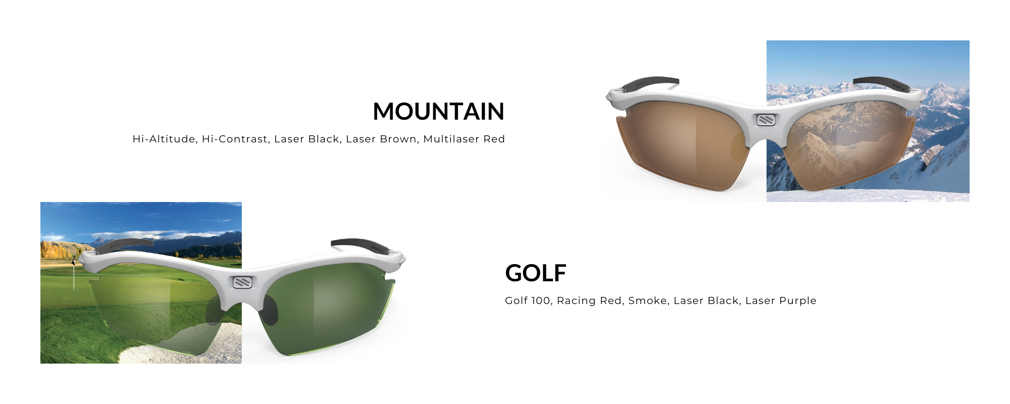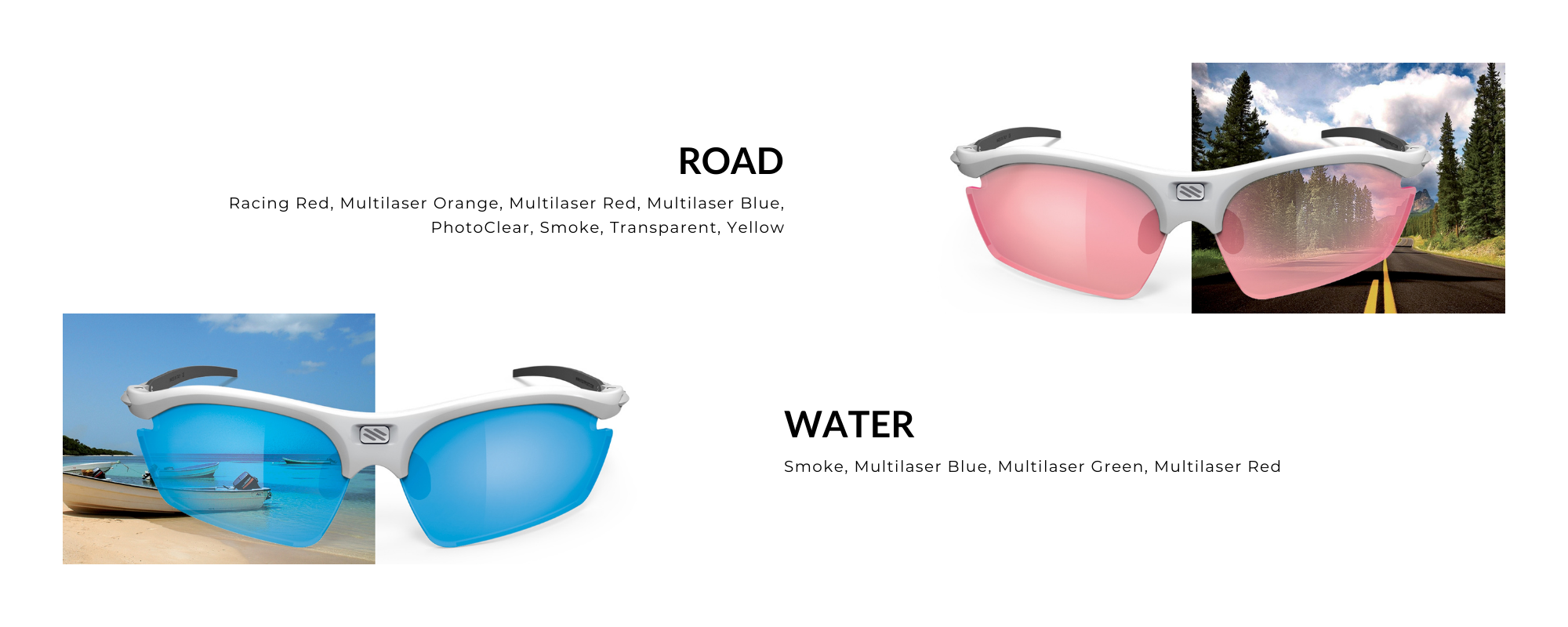 For particular light conditions, Rudy Project offers technically advanced specialty lenses with high visual quality tailored to your needs. The various lenses enable you to perform and excel in any light or atmospheric condition you may encounter. RP Optics is a design philosophy that aims to improve visual performance and eye protection by means of selective lenses with high optical and mechanical performance, combined with the most advanced technologies and scientific applications.